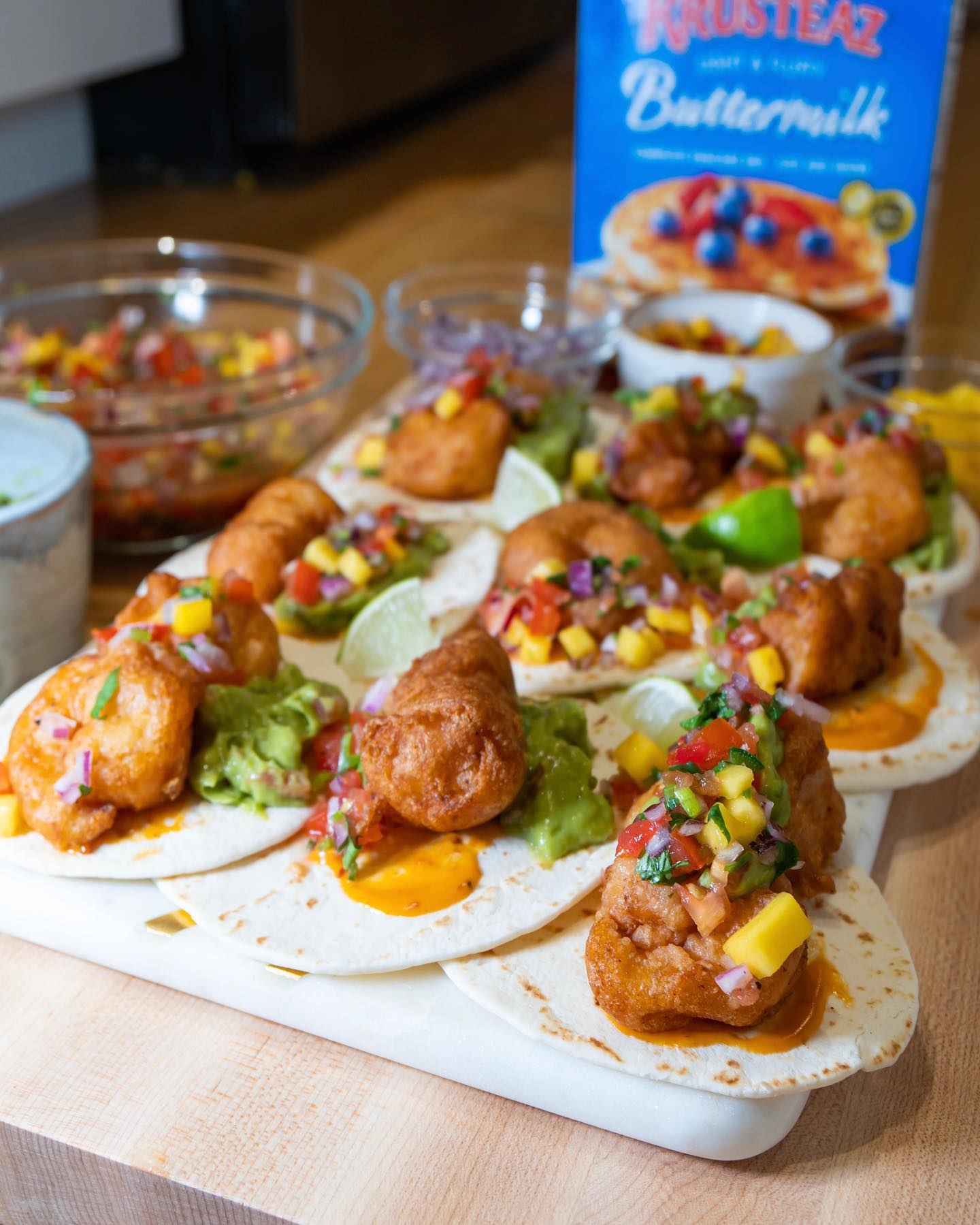 Indulge in a tantalizing twist on classic seafood tacos with our Pancake Beer Battered Shrimp/ Fish Tacos. Crispy golden shrimp or fish are coated in a unique blend of pancake batter and beer creating a perfectly light and fluffy texture that pairs harmoniously with the zesty flavors of fresh salsa creamy avocado or a tangy lime crema.
