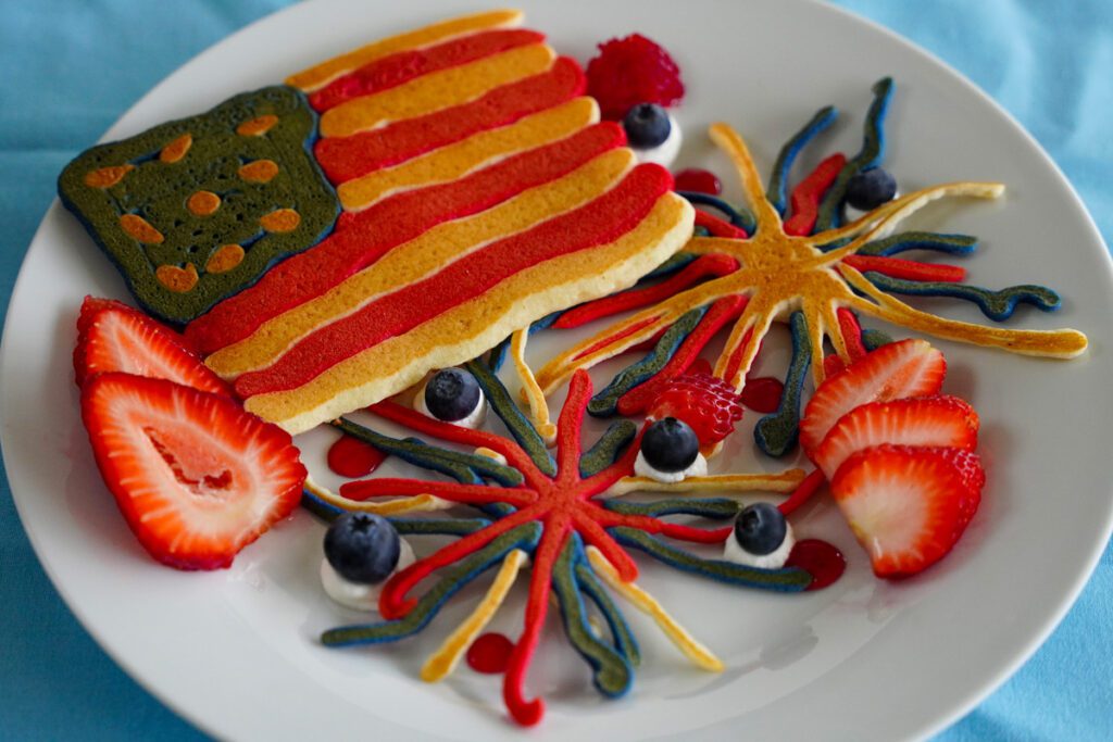 Starting with the uncolored batter, squeeze out a small circle (about 2-3 inches in diameter) onto the griddle to form the center of the firework. Next, use the red batter to draw several radiating lines from the center circle outward, creating a starburst effect. Follow with the blue batter, drawing lines between the red lines to complete the firecracker shape.